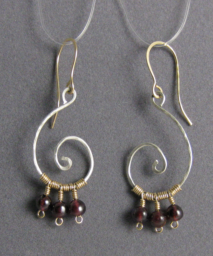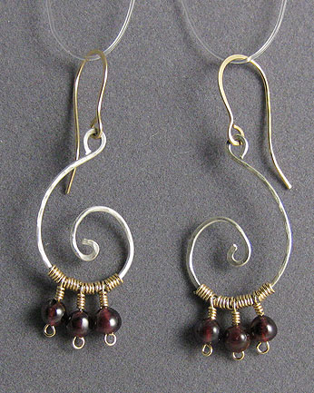 These earrings are an interesting mixture of hammered Argentium sterling silver and 14/20 gold-filled wire. The silver spirals are lightly hammered to add texture, which contrasts with the smooth gold wire. The round, smooth garnet beads swing freely to add some motion.