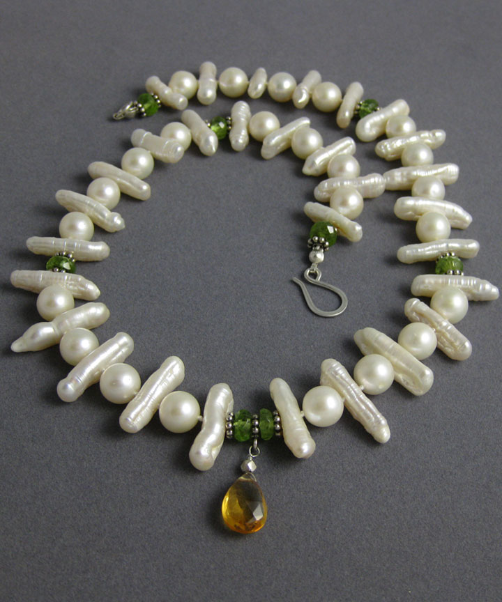 This necklace is a dramatic combination of white 8-mm round and stick cultured freshwater pearls. Interspersed with the pearls are faceted peridot roundelles and sterling silver spacer beads. The necklace has a silky, but substantial, feel. The pendant is a pear-shaped citrine gemstone. The clasp is sterling silver.