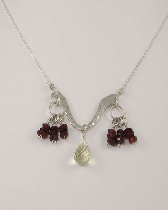 This pendant has a lot of motion. A delicate silver chain connects to the chandelier base, which is made up of hammered Argentium sterling silver in an open vase shape. Strings of garnet rondelles hang from each side of the pendant and a lemon quartz briolette hangs in the center. The sterling silver clasp is surrounded by garnets and silver cubes.