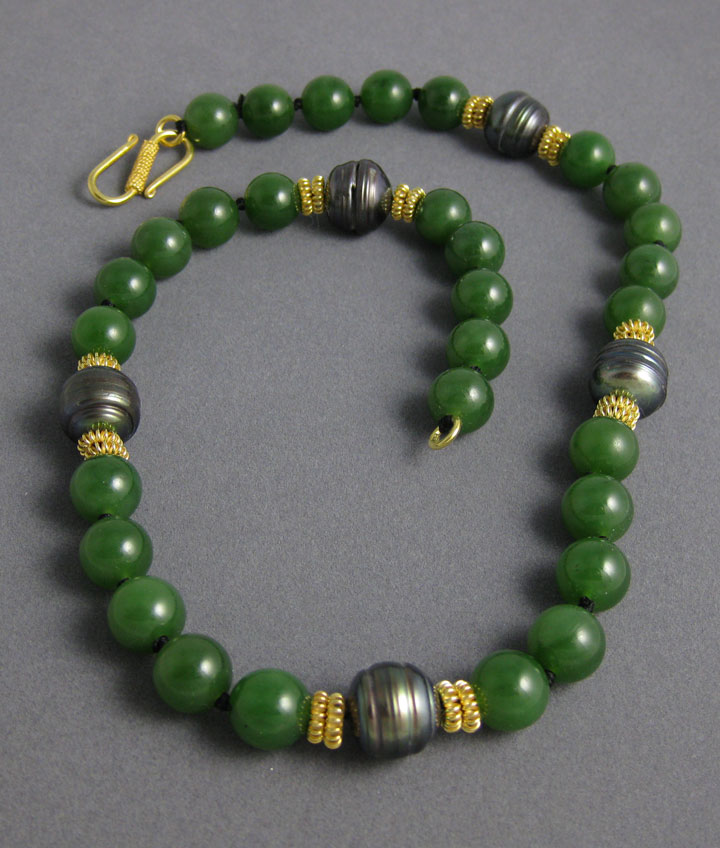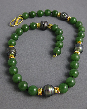 Large black cultured freshwater circled pearls and vermeil beads accent bright green nephrite jade beads for a rich, elegant look.