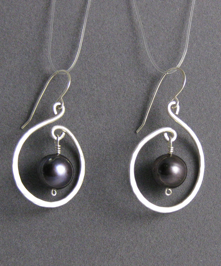 These cultured freshwater pearls are suspended within a heavy silver ring. These earrings are similar to item #2270.