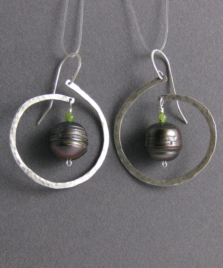 These cultured freshwater circle pearls are suspended within an open silver ring. These earrings are similar to item #2269.