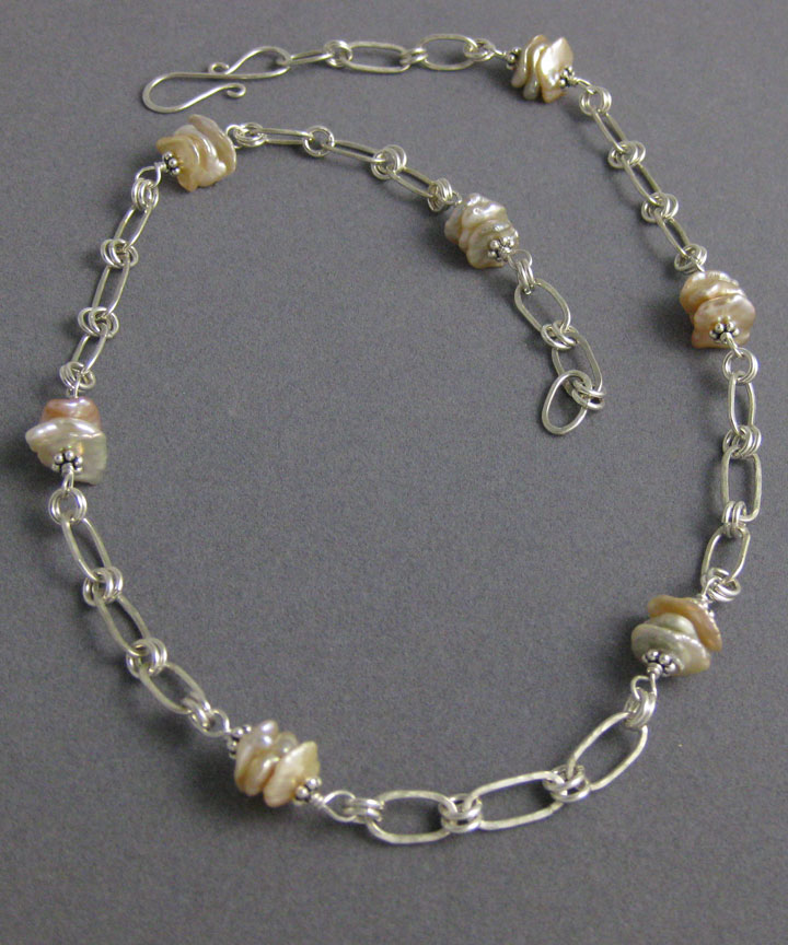 This chain combines lightly hammered oval links with natural-color cultured freshwater keshi pearls.