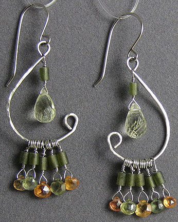 These lovely earrings combine orange and greenish sapphires with a pale yellow beryl and jade accents. The metal is palladium with a lightly hammered finish.