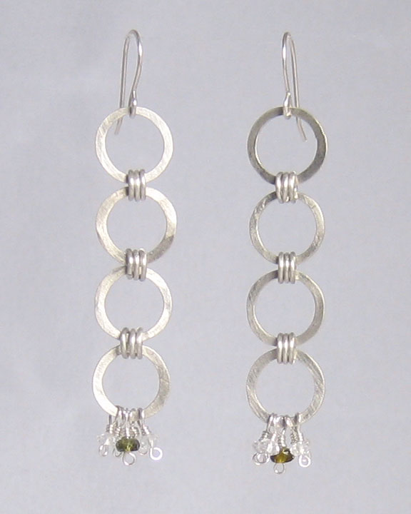 These long, slinky earrings are made up of interlinked hammered and round loops. Colorless topaz and green tourmaline add some color and sparkle.