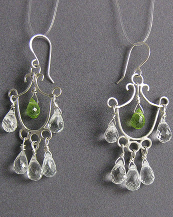 These long, dangly earrings combine very pale aquamarine briolettes with bright-green peridot.