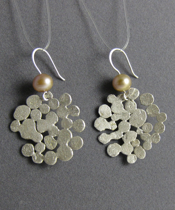 These earrings are made of fine silver disks fused together into a circle. The silver has a matte, textured finish. Small pinkinh yellow cultured freshwater pearls accent the metal.