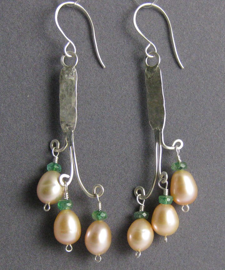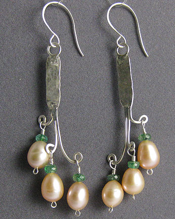 These dangly earrings have an Argentium sterling silver framework from which orange cultured freshwater pearls and green beryl gems are suspended.