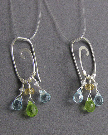 These earrings consist of hammered Argentium sterling silver spirals. Blue, green, yellow and colorless gems accent the spirals.