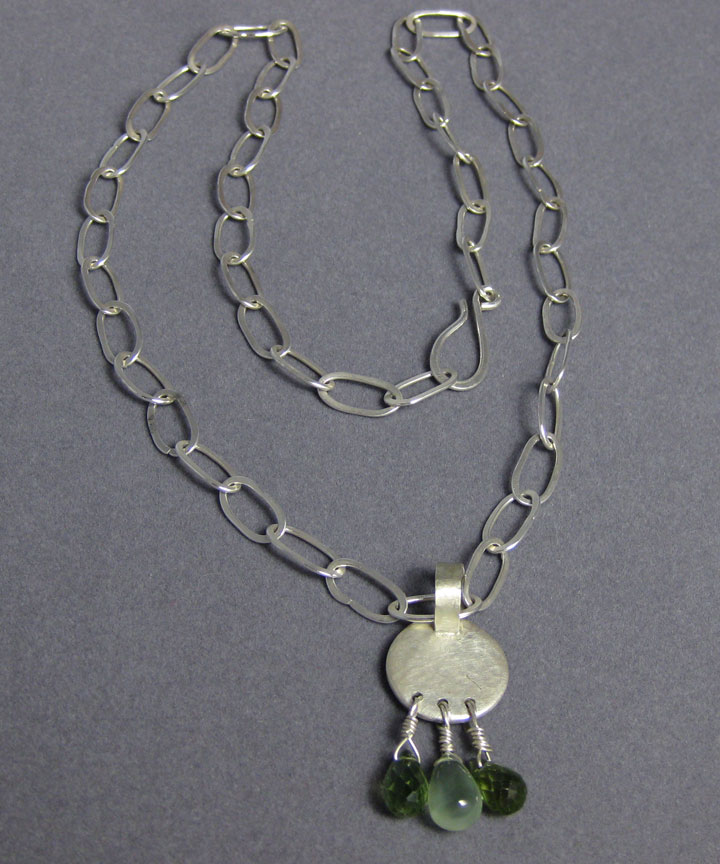 This pendant features a hammered Argentium sterling silver disk. Hanging from the disk are 3 gemstones: two dark green apatite briolettes and one page green prehnite smooth drop. The pendant is hanging from a fine silver single loop-in-loop chain.