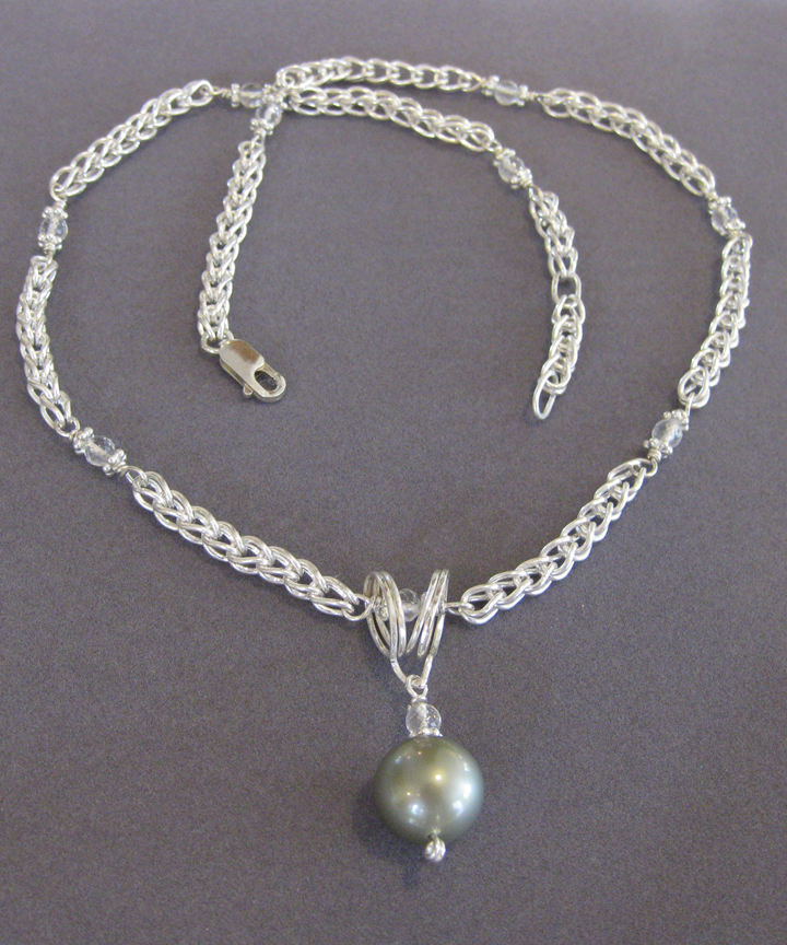 This handmade chain is dotted with faceted colorless quartz beads. It features a silvery gray tahitian pearl pendant.