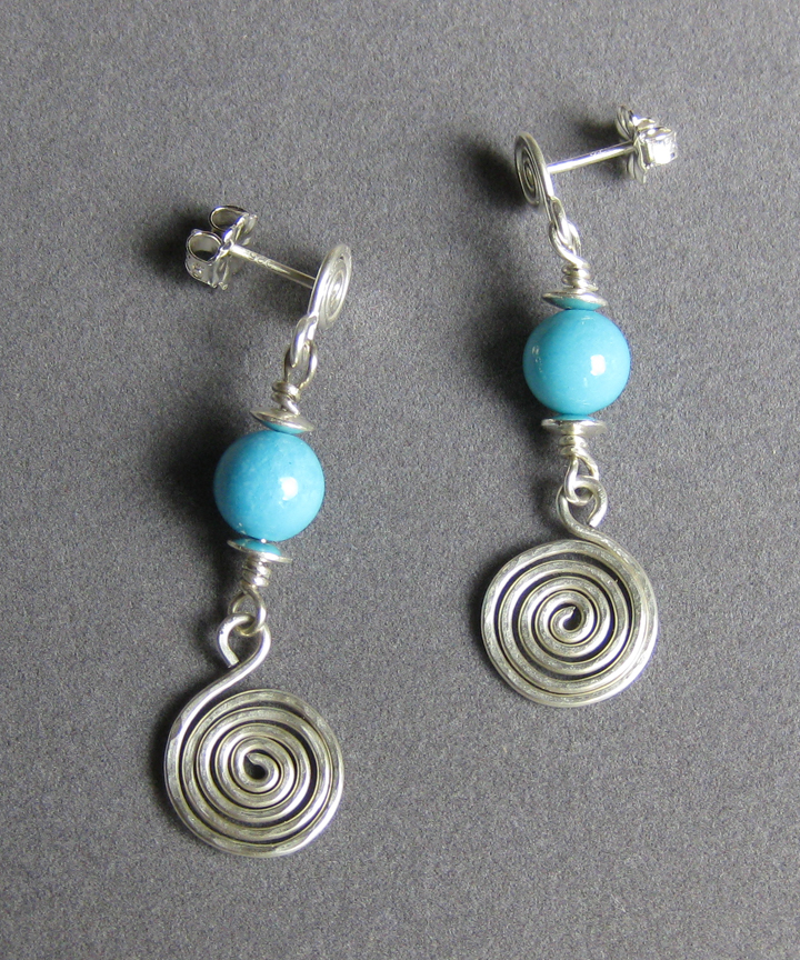 In these earrings, turquoise beads are sandwiched between two silver spirals.