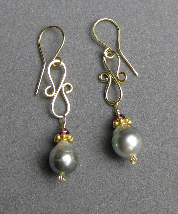 These earrings feature gray tahitian pearls, accented with rhodolite garnet beads, hanging from curls of 14k gold-filled wire.