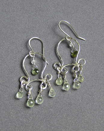 These chandelier earrings feature greenish aqumarine briolettes and are accented with green sapphires.