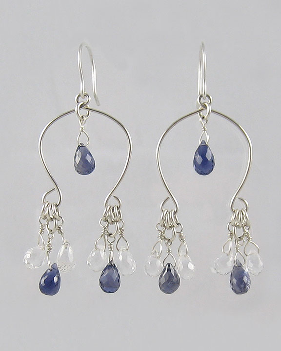 Briolette gemstones swing freely from all sides of these Argentuim sterling silver earrings. Two white topaz and one iolite briolette hand from each end of the horseshoe. Another iolite briolette hangs in the center.