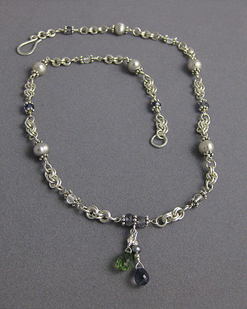 This Argentium sterling silver chain is simple and elegant. It combines interlinked silver rings with clear quartz and iolite faceted round beads and gray pearls. The pendant features iolite and apatite briolettes. The clasp is sterling silver. This chain is very supple and has a nice feel.