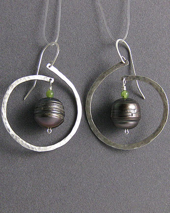These cultured freshwater circle pearls are suspended within an open silver ring. These earrings are similar to item #2269.