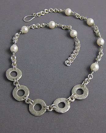 This substantial chain showcases 5 large hammered Argentium sterling silver disks. The chain alternates doubled links with white cultured freshwater pearls.