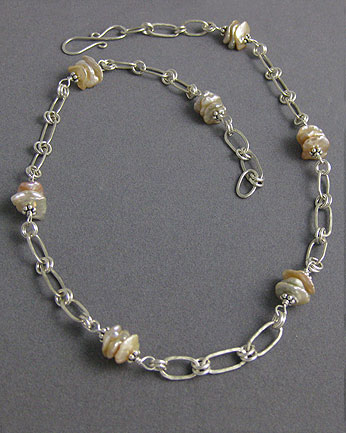 This chain combines lightly hammered oval links with natural-color cultured freshwater keshi pearls.