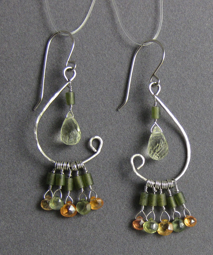 These lovely earrings combine orange and greenish sapphires with a pale yellow beryl and jade accents. The metal is palladium with a lightly hammered finish.