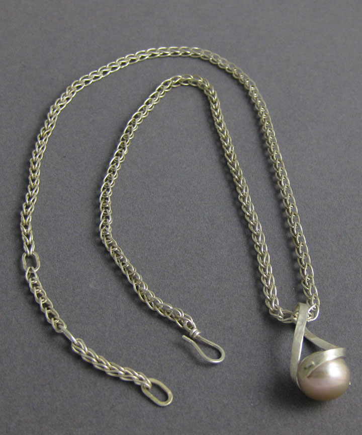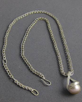 This pendant shows off a pink cultured freshwater pearl in a twist setting. The chain consists of delicate woven links.