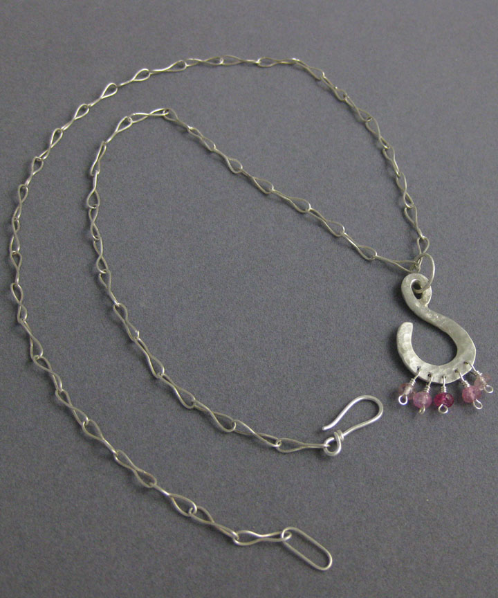 This hammered pendant has a suite of pinkish tourmalines, ranging from light pink to dark magenta. The chain is sterling silver.