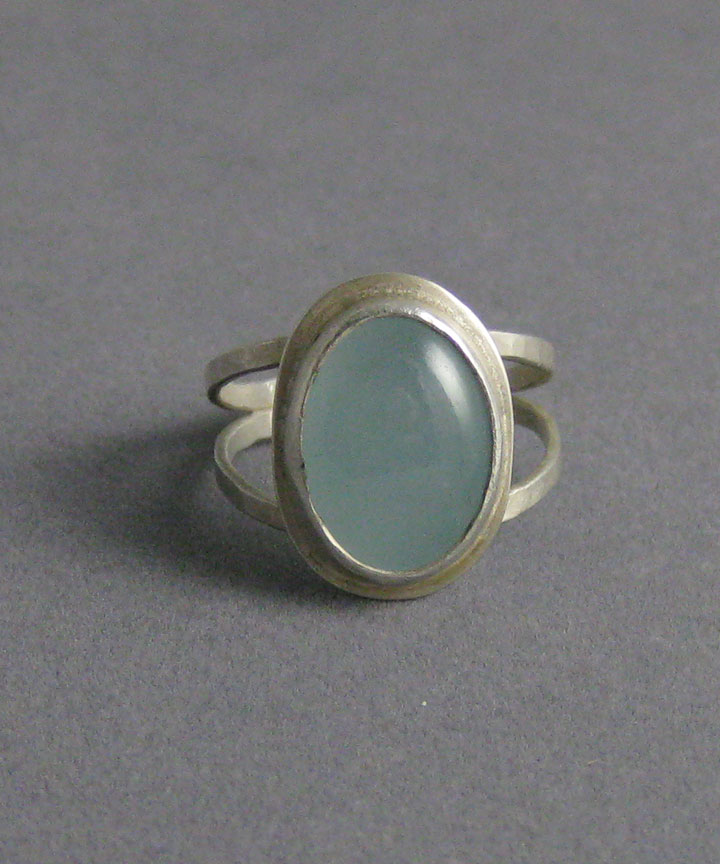 This ring features a large translucent aquamarine cabochon in an Argentium sterling silver setting with a matte finish. Size 7.
