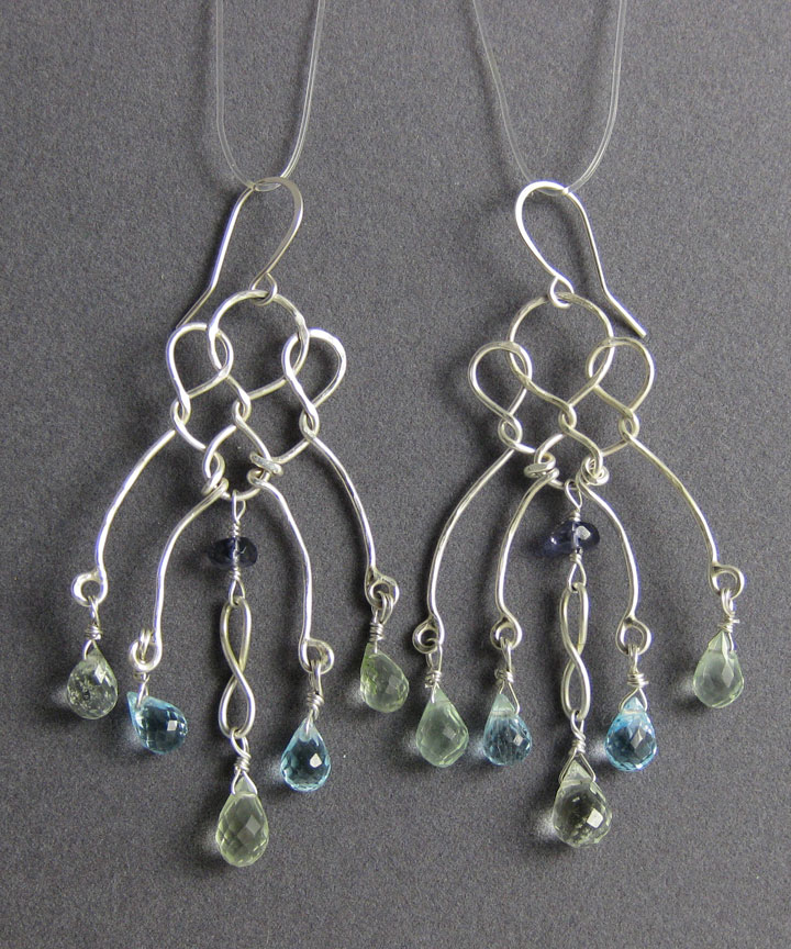 These dangly earrings are made of long intertwined silver wires. Blue topaz and green beryl gems dot the end of the wires.