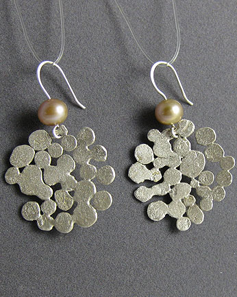 These earrings are made of fine silver disks fused together into a circle. The silver has a matte, textured finish. Small pinkinh yellow cultured freshwater pearls accent the metal.