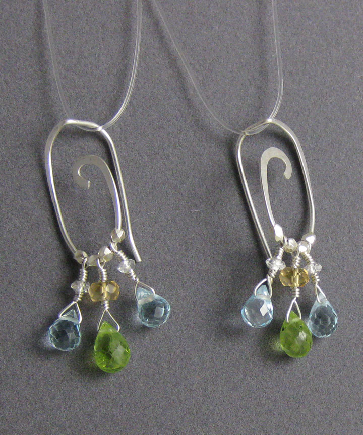These earrings consist of hammered Argentium sterling silver spirals. Garnet and jade gems accent the spirals.