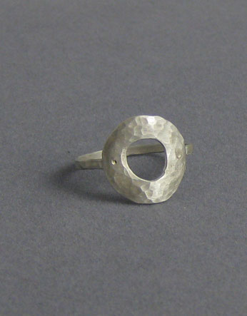 This Argentium sterling silver ring consists of a hammered open silver circle on top of a thin band.
