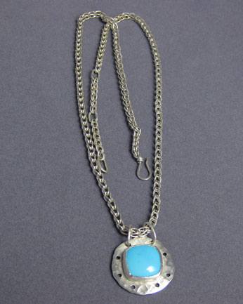This pendant showcases a bright blue turquoise cabochon in an Argentium sterling silver setting. The chain has delicate twisted links.