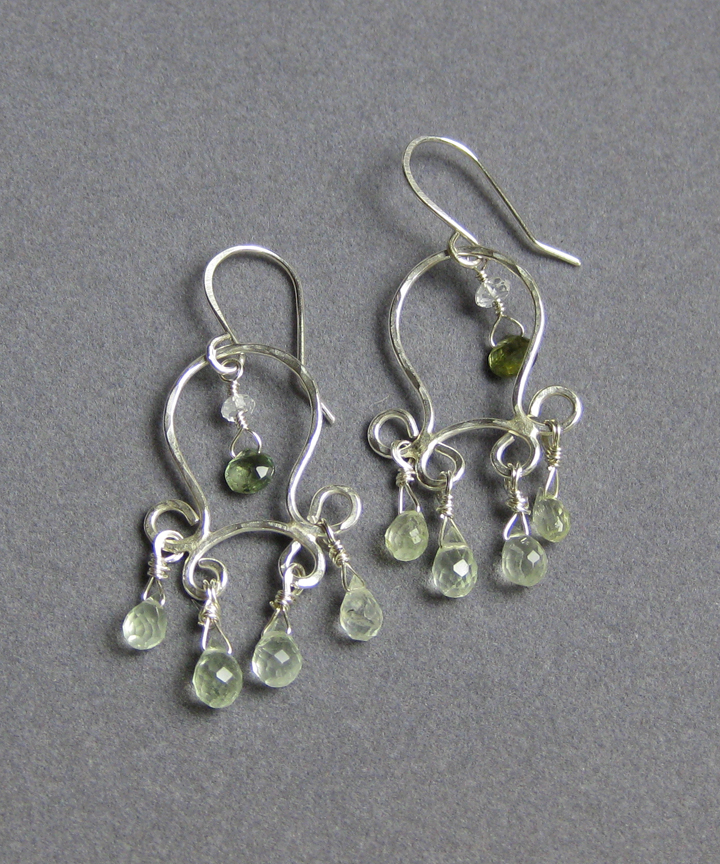 These chandelier earrings feature greenish aqumarine briolettes and are accented with green sapphires.